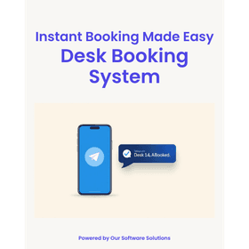 The included Telegram bot lets employees check availability, book, and cancel from their phone in seconds — no app download, no new login.