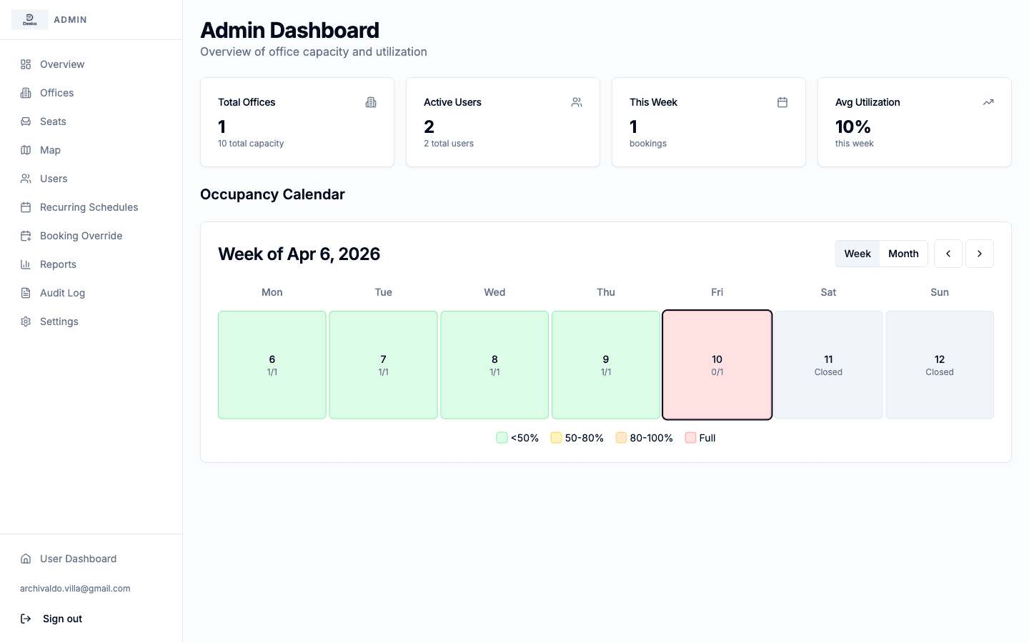 - Admins see real-time and historical occupancy by floor, zone, and date.